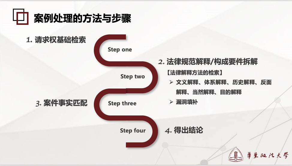 王源盛律师:今天讲到的法学方法,我在实践中一直在运用。这种方法落实到实践中,对我影响比较大的就是邹碧华老师《要件审判九步法》,我自己也总结了诉讼律师的九步法,包括分析案件法律关系、确定当事人诉讼目标、检索请求权基础、分解请求权基础、确定诉讼主张、证据证明等。