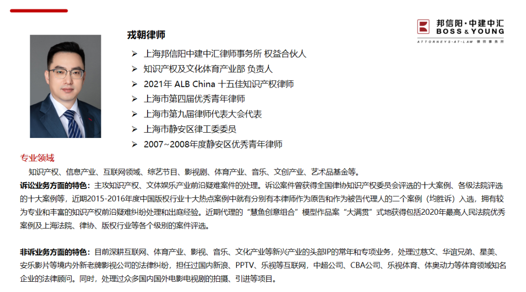戎朝律师团队专注于知识产权领域,涉及文化、体育、影视、娱乐、艺术品等行业,尤其在体育产业及影视娱乐领域深耕多年,是国内较早的一批专注从事文化创意体育娱乐产业法律服务的专家团队之一,尤其是在针对互联网环境下产生的各类新型前沿案件,都具有丰富的实务经验,代表客户包括中超公司、体奥动力、NBA中国、苏宁体育、WBA、Osports、乐视体育、华谊兄弟、PPTV、新浪SINA、荣信达、国际唱片业协会、安乐影片、体育之窗等。
