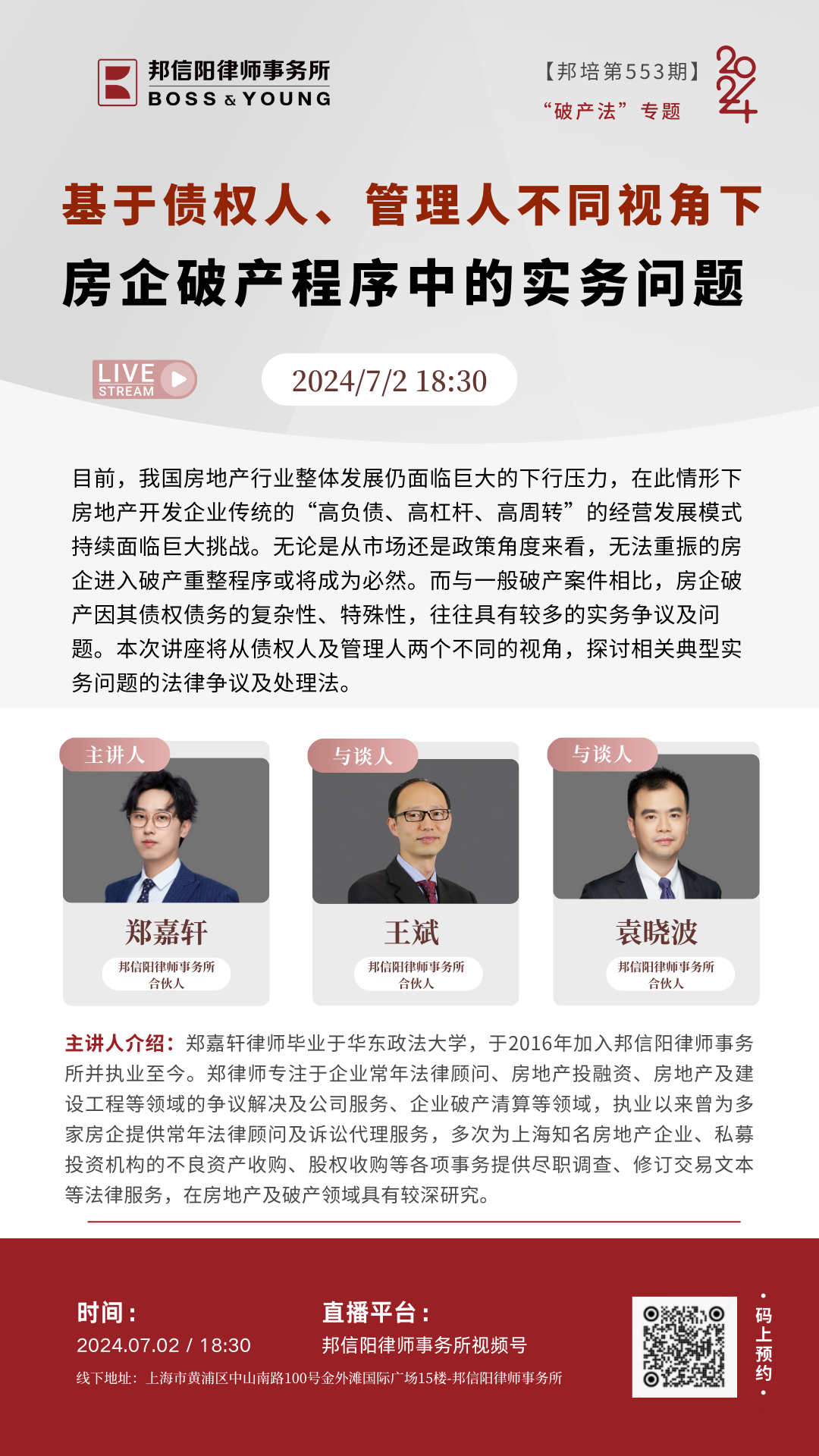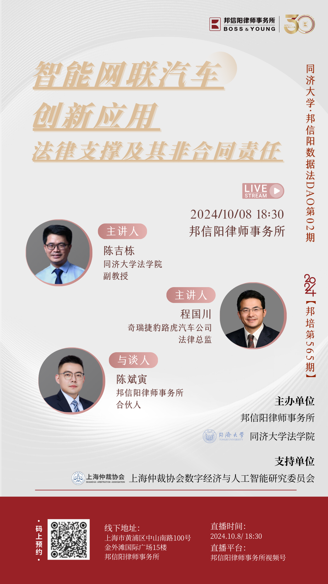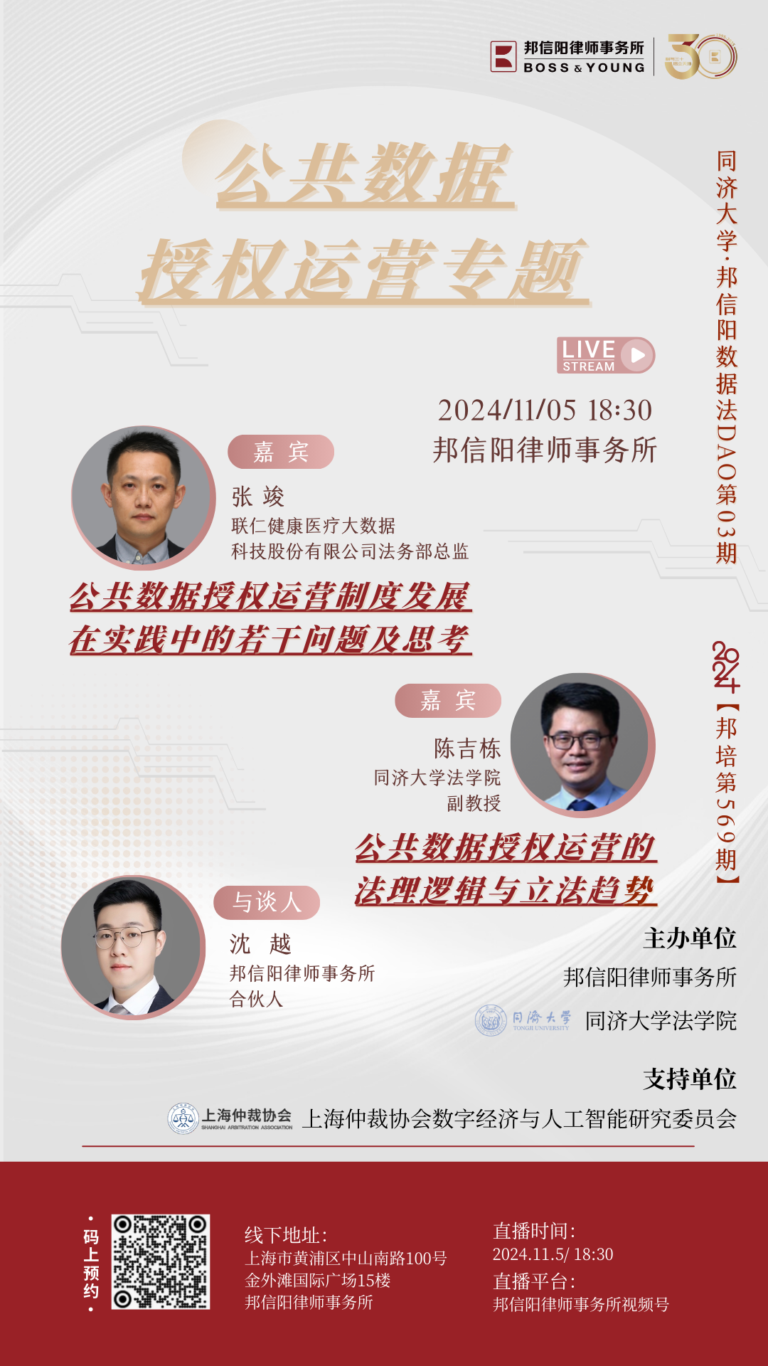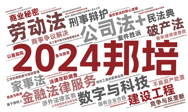 2024年,由邦信阳律师事务所精心策划和组织的邦培系列课程从第535期举办到了第575期。每周二晚18:30,聚焦法学理论及律师实务中的热点、难点问题,邦信阳律师事务所的合伙人、资深律师以及外部专家学者倾囊相授,青年律师互动讨论沉浸式开展学习,课程同步直播惠及广泛人群体,开展多维度对话。
