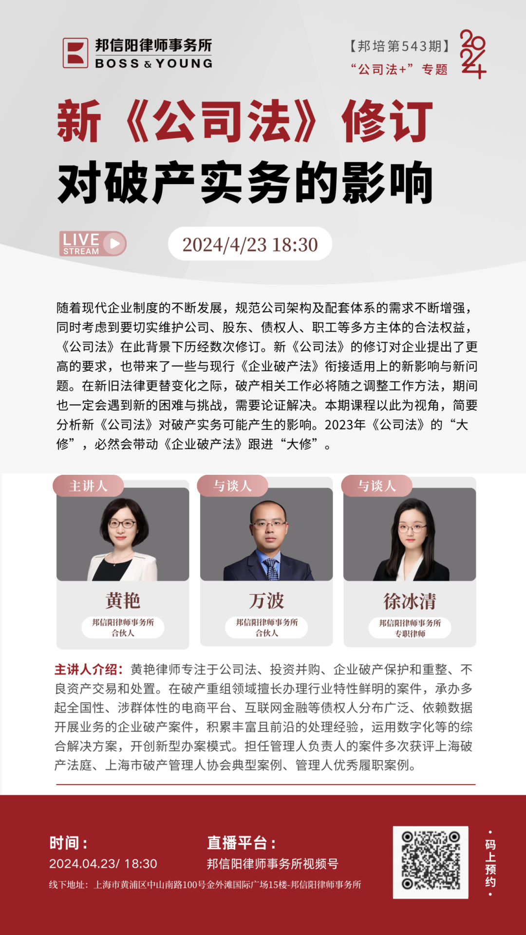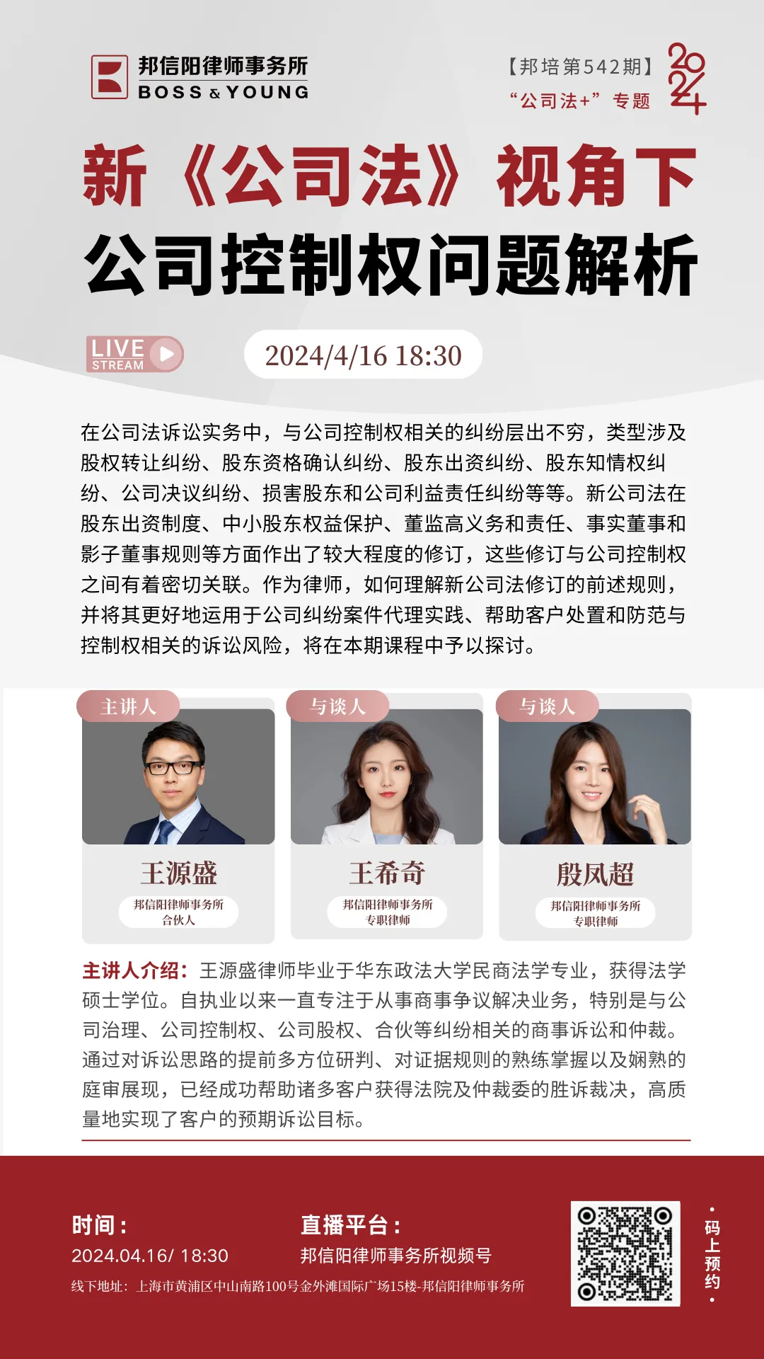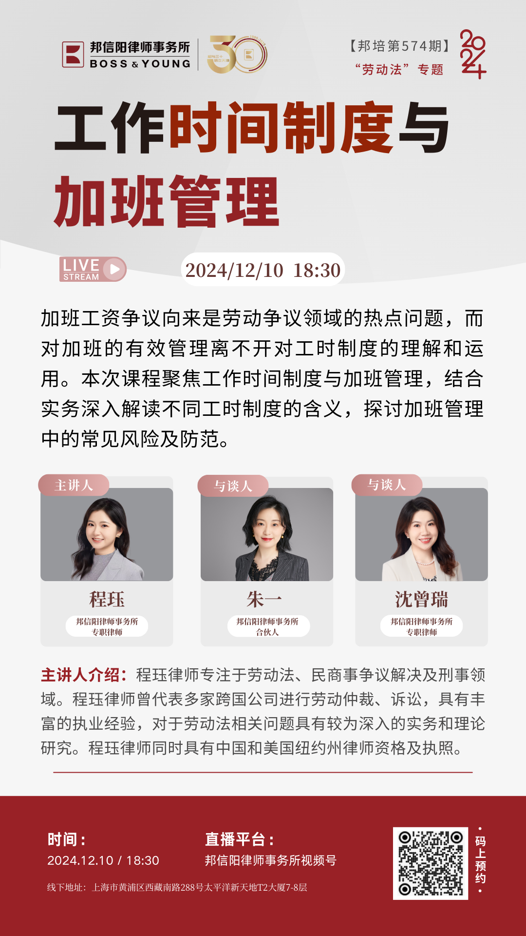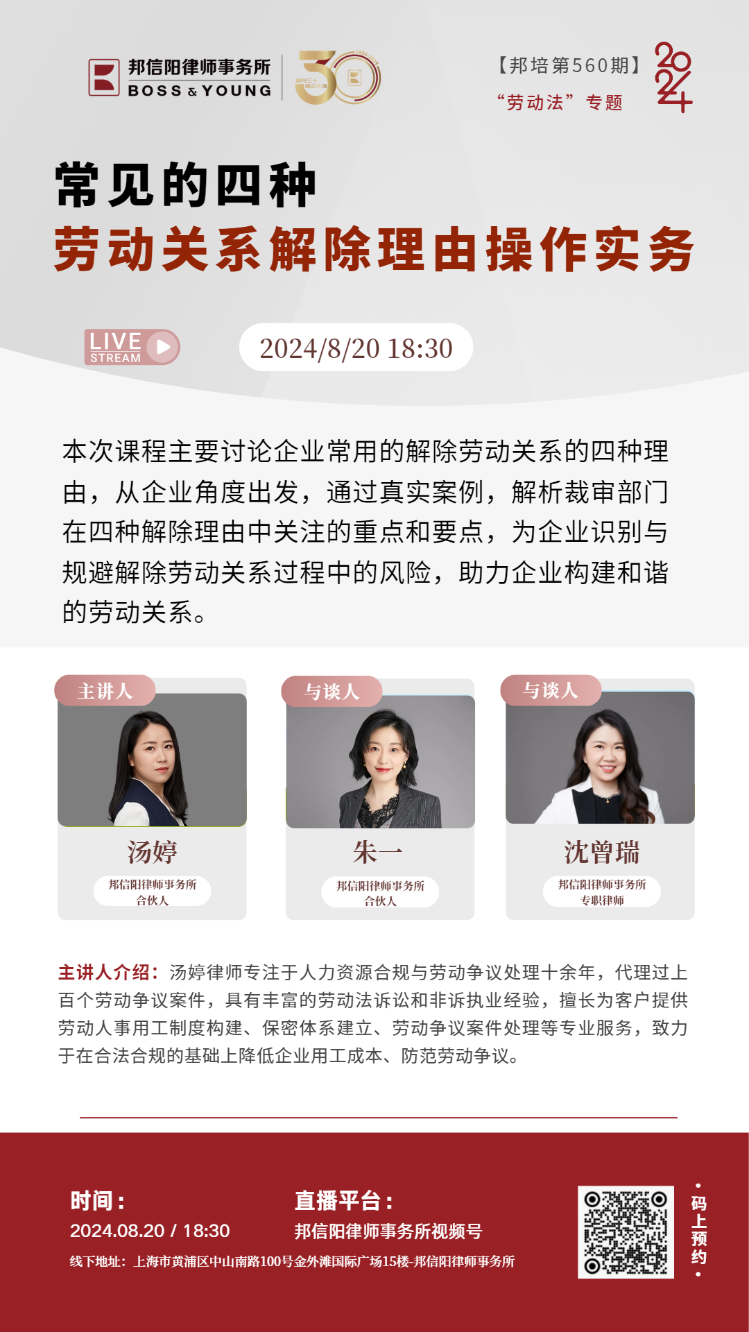 2024年,由邦信阳律师事务所精心策划和组织的邦培系列课程从第535期举办到了第575期。每周二晚18:30,聚焦法学理论及律师实务中的热点、难点问题,邦信阳律师事务所的合伙人、资深律师以及外部专家学者倾囊相授,青年律师互动讨论沉浸式开展学习,课程同步直播惠及广泛人群体,开展多维度对话。
