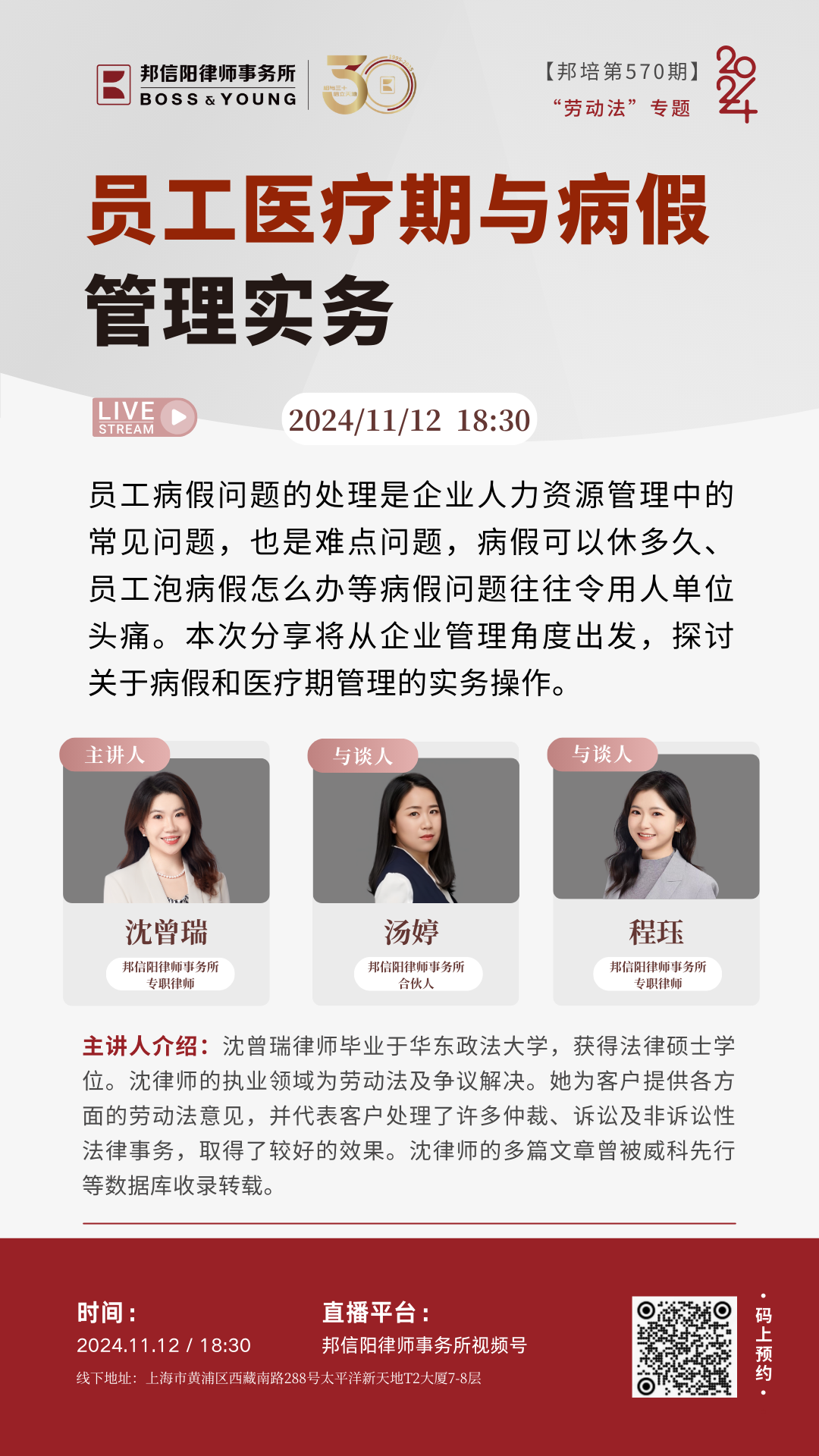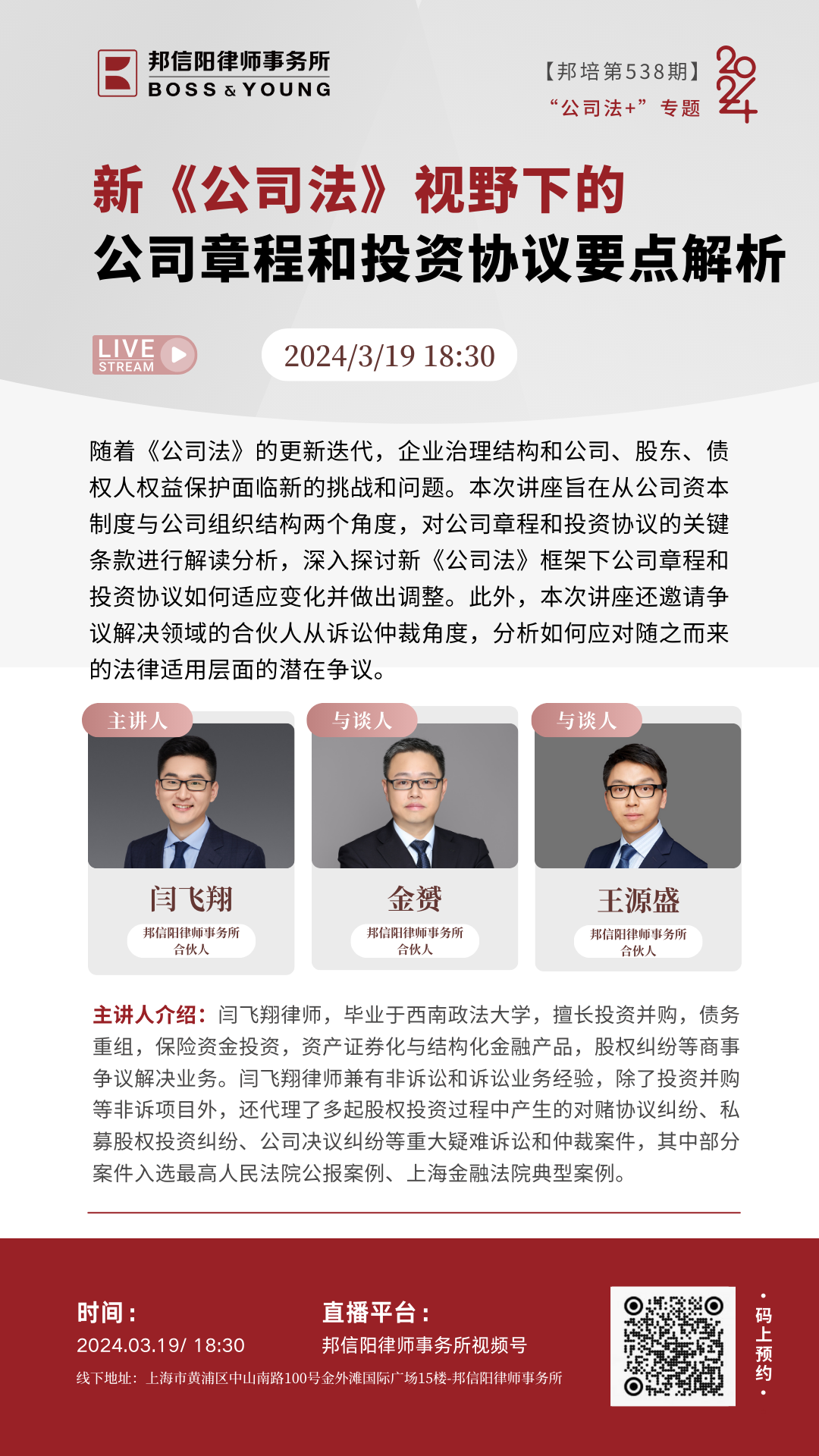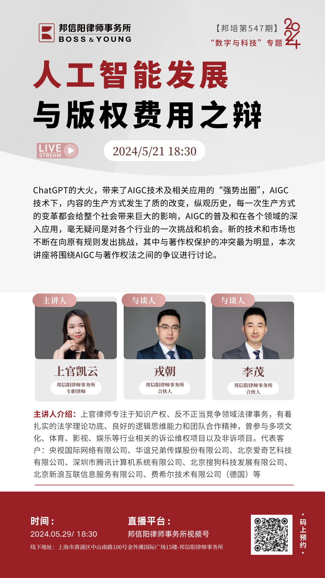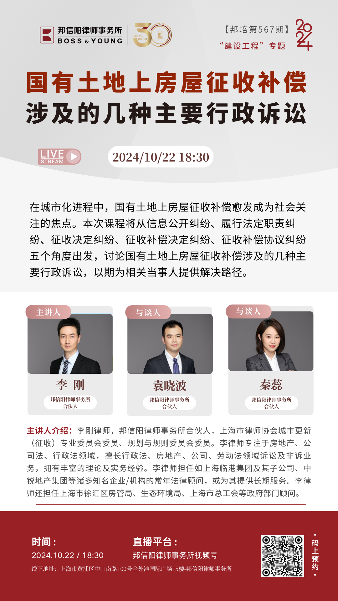 2024年,由邦信阳律师事务所精心策划和组织的邦培系列课程从第535期举办到了第575期。每周二晚18:30,聚焦法学理论及律师实务中的热点、难点问题,邦信阳律师事务所的合伙人、资深律师以及外部专家学者倾囊相授,青年律师互动讨论沉浸式开展学习,课程同步直播惠及广泛人群体,开展多维度对话。