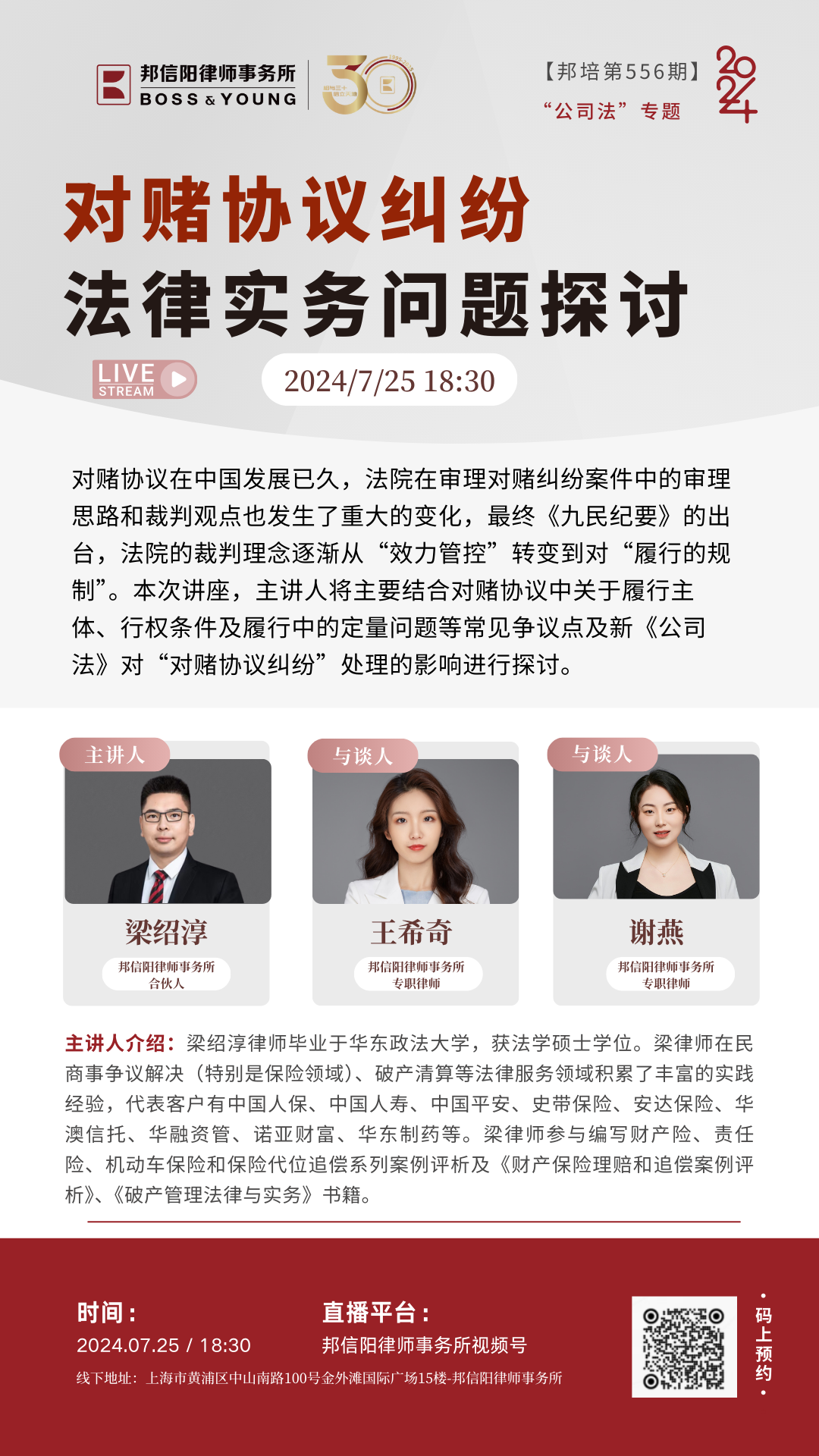 在各方的支持与共同努力下,邦培系列课程成为了邦信阳律师事务所践行专业长期主义的有力注脚,也发展成为一个具有一定影响力的高质量学习及交流平台。