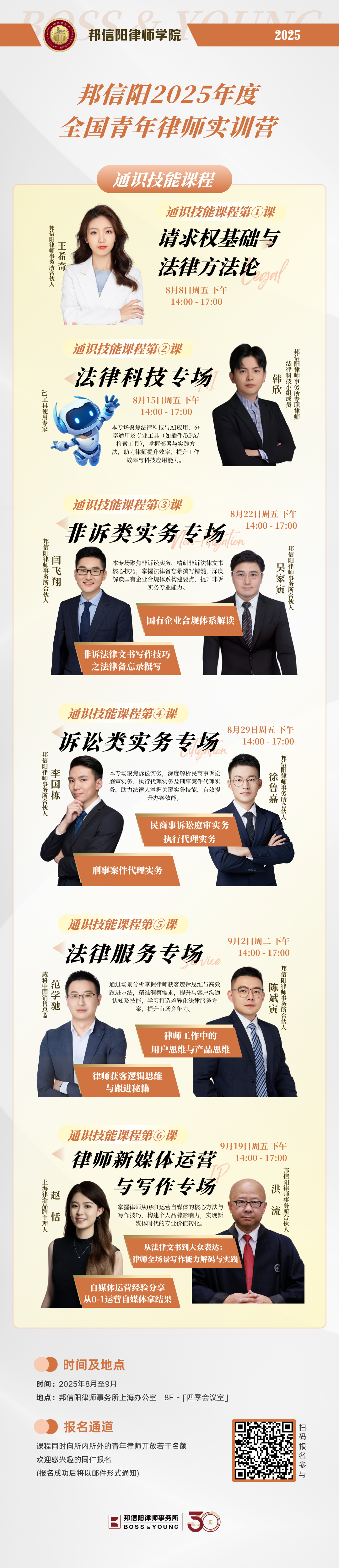 为使课程惠及更多心怀热忱的青年律师,我们特向感兴趣的同仁开放若干名额,欢迎扫描海报上的二维码进行报名。报名成功后,我们将以邮件形式告知。期待与各位青年才俊一同开启法律职业的新篇章,探索律师事业无限可能!