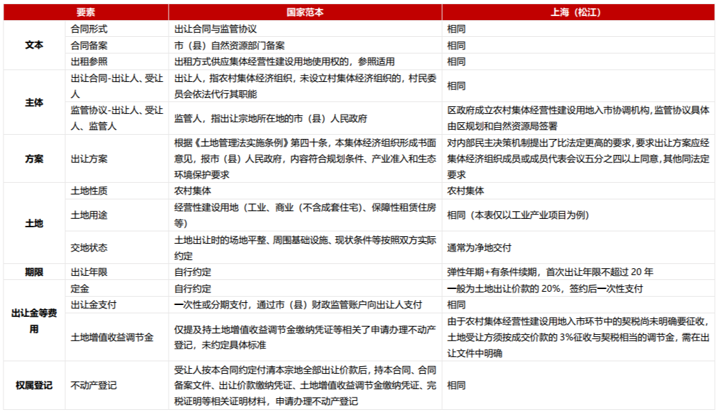 2015年以来,上海市松江区作为全国三十三个试点地区之一,不断实践完善集土入市制度,且上海从2014年开始不断加强工业用地出让管理,已形成较为成熟的产业用地全生命周期管理模式。此次国家示范文本中可以看到上海集土入市试点和产业地产管理经验的大量元素,我们将主要条款内容进行对比梳理,具体见附表-集土入市示范文本与上海试点条款比对表。