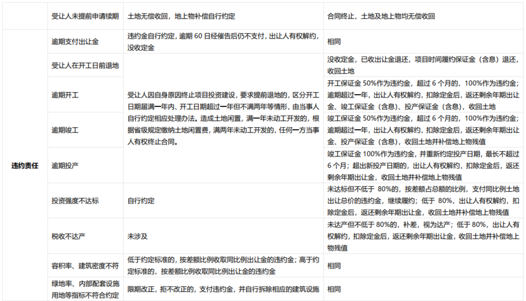 示范文本在“第五章期限届满与使用权终止”和“第七章违约责任”分别设置了集土使用权收回条款,其目的可能是为了区分合同因法定情形而终止和因违约而导致合同解除两种情况下的集土使用权收回安排(从合同条款设计角度,因为有些导致法定终止的情形同时也构成违约行为(例如,违反约定用途使用土地、违反产业准入要求、生态环境保护要求等使用土地等),在具体撰写条款时需要特别注意,以免因为示范文本的分章编排造成条款遗漏、重复或者前后矛盾)。