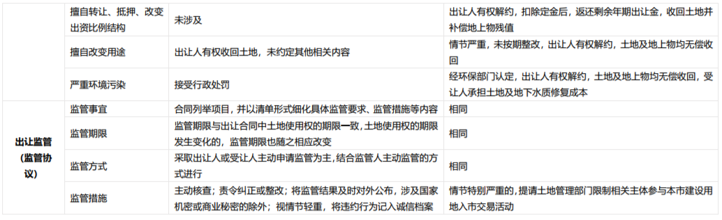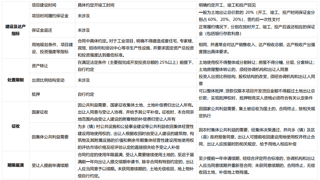 注:下表仅以上海工业用地产业项目类作为比较对象,且视具体出让项目情况,上海实践中部分条款内容会存在差异。(获取附表word版本可关注本公众号并发送“集体土地入市”获取)