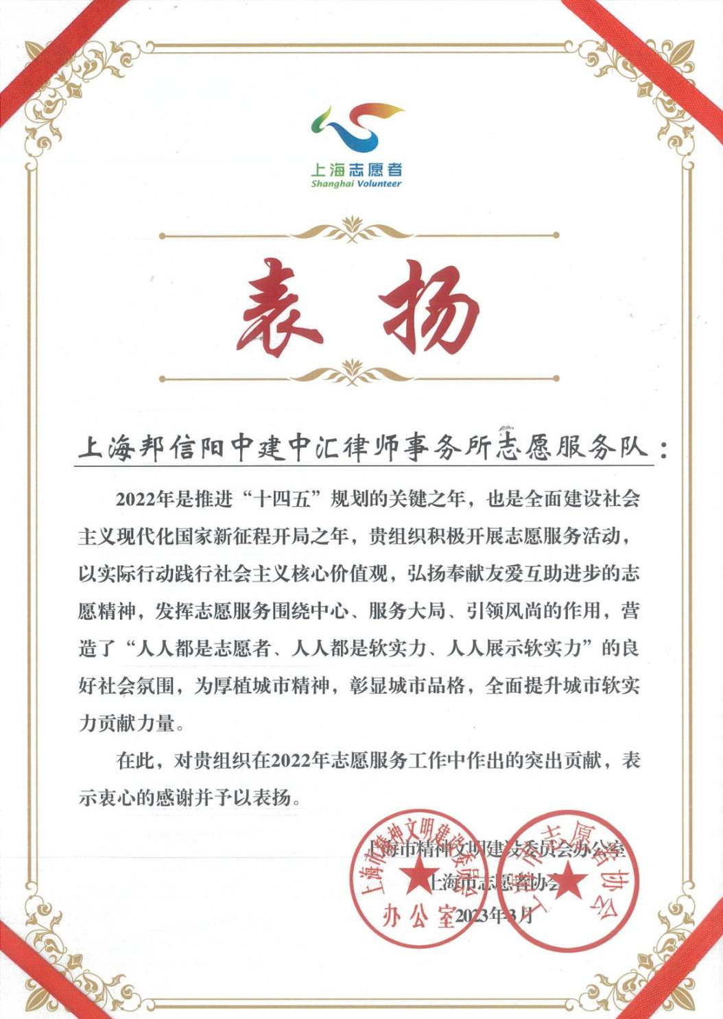 近日,邦信阳中建中汇律师事务所志愿服务队受到上海市精神文明建设委员会办公室和上海市志愿者协会的表扬。