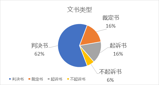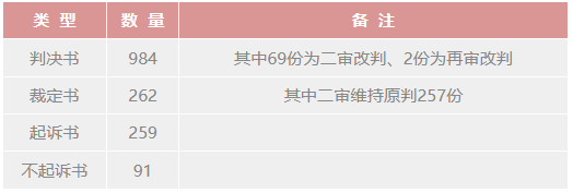 在全部检索到的1609份法律文书当中,我们对文书的类型进行了简单的区分,基本类型和数量如下表: