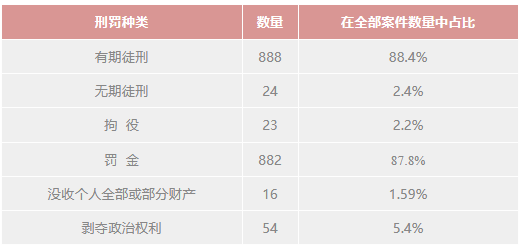 在所有案件结果中,最终给予刑事处罚的案件数量为968件,其中一审908件,二审60件,免予刑事处罚的数量为17件,最终宣告无罪为1件。在一审判处了刑罚的案件当中,各刑罚涉及的案件数量为(自由刑、财产刑和政治附加刑可能重叠):