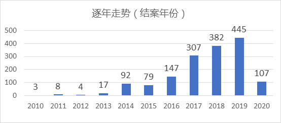 我们按照每个案件结案时间所在的年份,将案件进行了时间划分处理,从而得出每年的相关案件数量,最终得到的结果如下: