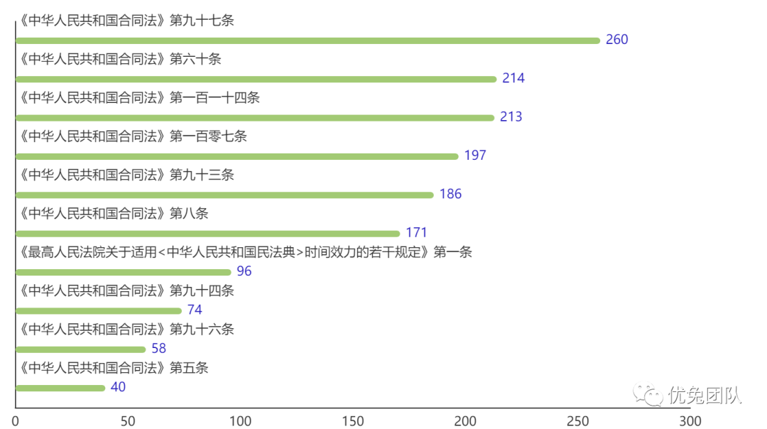 如上图所示,近三年来房屋租赁合同纠纷引用的实体法数量排行前三名依次为:《中华人民共和国合同法》第九十七条、第六十条以及第一百一十四条(2020年5月28日,十三届全国人大三次会议表决通过了《中华人民共和国民法典》,自2021年1月1日起施行,《中华人民共和国合同法》同时废止。)。