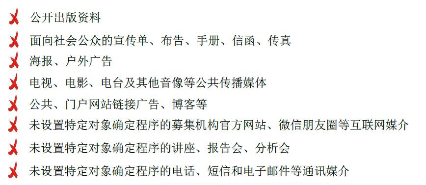 除《征求意见稿》中已明令禁止的募集行为外,《办法》中对于使用“欲购从速”、“申购良机”等片面强调集中营销事件限制的措辞,推介或片面节选少于6个月的过往整体业绩或过往基金产品业绩,采用不具有可比性、公平性、准确性、权威性的数据来源和方法进行业绩比较,任意使用“业绩最佳”、“规模最大”等相关措辞等募集行为亦予以了禁止,即基金业协会允许私募基金管理人在推介材料中引用过往业绩,并对业绩进行比较,但该等引用和数据比较均强调客观、科学、公平、准确,以防止对投资者产生误导。另,在禁止的募集渠道方面,基金业协会在《办法》中将原“未经邀约面向公众的讲座、报告会、分析会”修改为“未设置特定对象确定程序的讲座、报告会、分析会”,即明确基金业协会并未完全禁止募集机构通过讲座、报告会、分析会等方式推介私募基金,但该等推介方式需设置特定对象确定程序,以符合私募基金非公开、向特定对象募集的特点。
