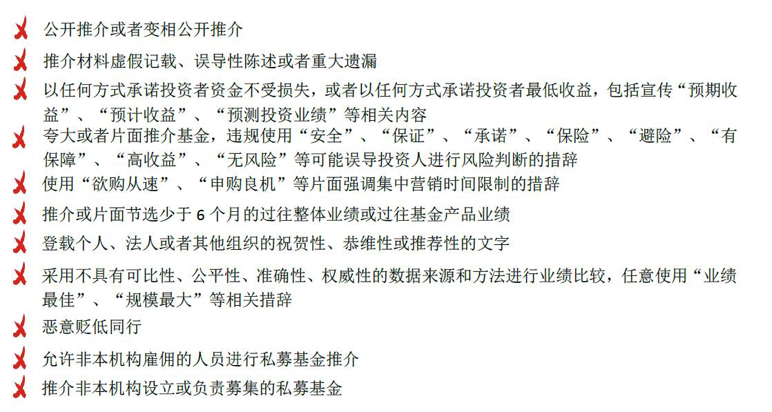 第二十二条 【禁止的推介行为】募集机构及其从业人员推介私募基金时,禁止以下行为: