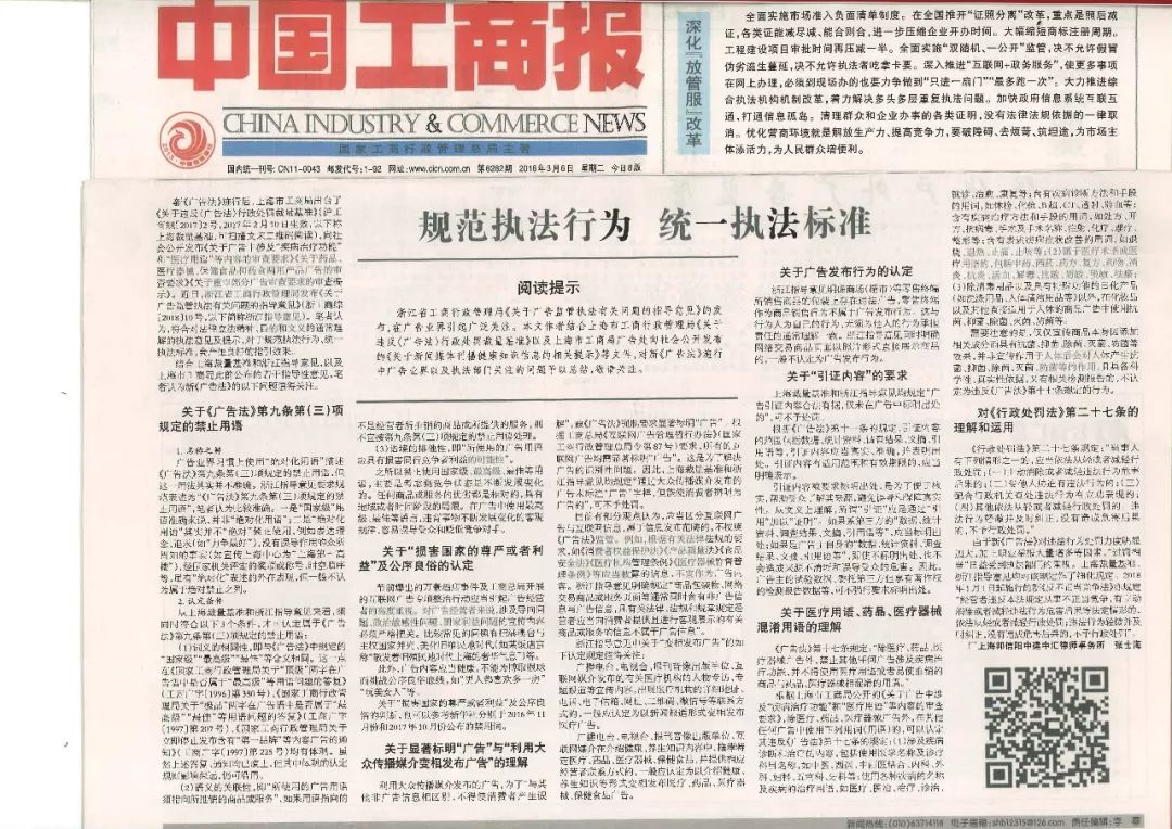 ▲《广告法实施疑难问题总结与合规提示》,载于“工商行政管理半月沙龙”,2018年2月24日,同时以“规范执法行为、统一执法标准”为题,刊载于2018年3月6日的《中国工商报》