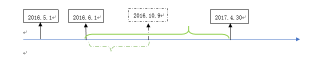 如图所示,假设员工A于2016年5月1日与公司建立劳动关系,之后公司一直未与A签订书面劳动合同。若A一直在公司工作至2017年4月30日以后,那么A最多可以向公司主张自2016年6月1日至2017年4月30日之间的双倍工资。若公司与A在2016年10月9日补签了劳动合同,则A可以向公司主张自2016年6月1日至2016年10月8日之间的双倍工资。