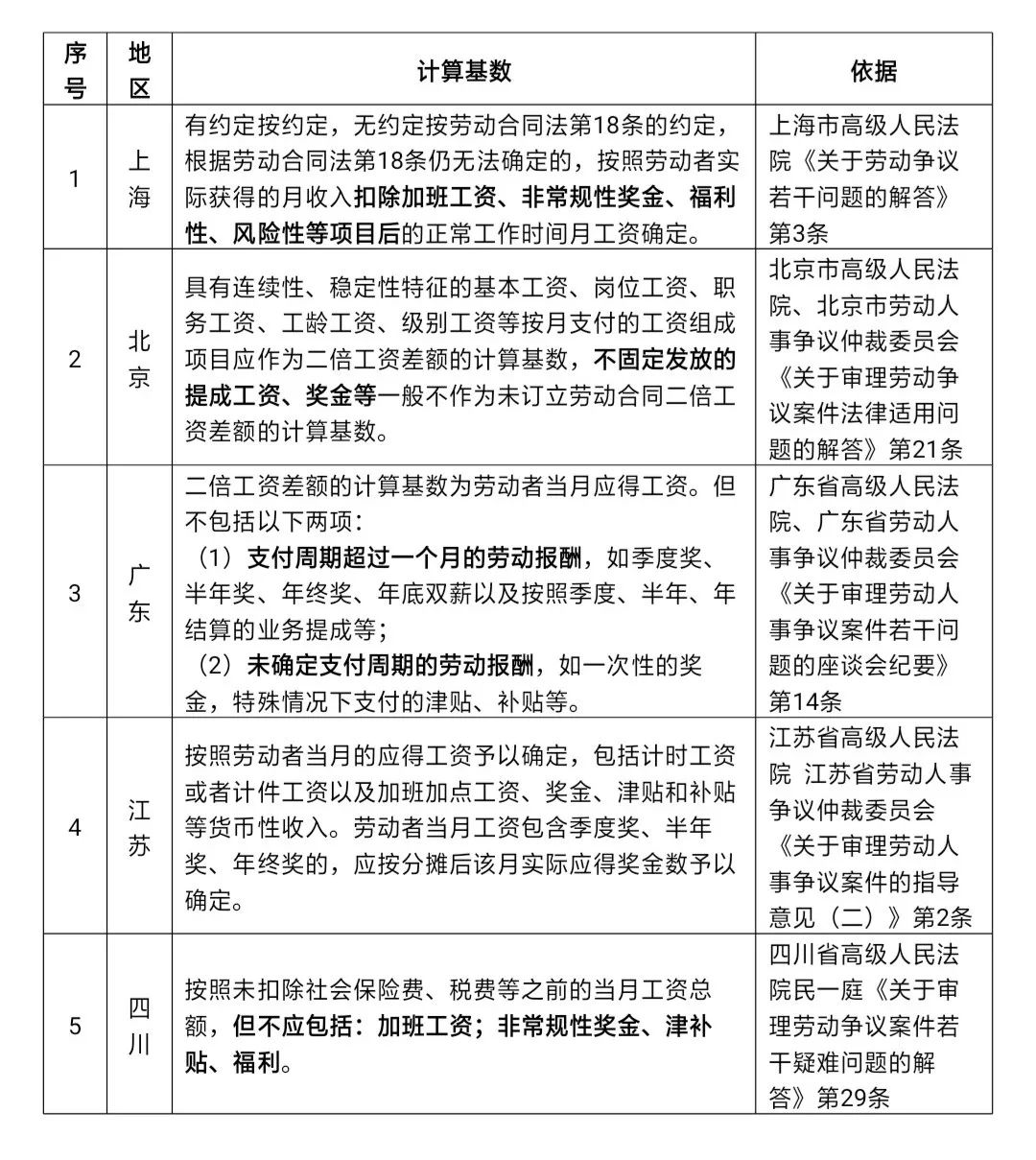 关于劳动者所主张的双倍工资的计算基数,不同地区的法院在审判实践中所依据的计算基数存在着差异。笔者摘录了几个主要省市的法院在审判实践中的关于双倍工资差额计算基数的标准,详见下图: