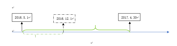 如图所示,若员工与A的前一份合同于2016年4月30日到期,到期后公司一直未与A续订书面劳动合同,则员工A可以向公司主张2016年5月1日至2017年4月30日之间的双倍工资。若公司于2016年12月1日与A补签了书面劳动合同,则员工A可以主张2016年5月1日至2016年11月30日之间的双倍工资。