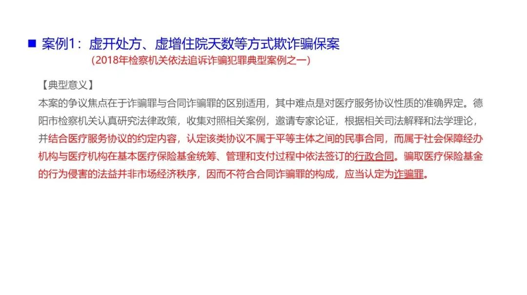 在欺诈骗保的打击当中,之前是以行政处罚为主,主要是惩罚性罚款。现在打击力度加大,出台了行刑衔接的相关规定。根据规定,骗取医保基金的行为适用刑法第二百六十六条诈骗罪论处。虽然骗保入刑了,但在实务中,不同情形下的骗保行为在法律适用上还存在不少问题。国家相继出台了配套文件。其中,《关于办理医保骗保刑事案件若干问题的指导意见》针对不同犯罪主体,侵犯不同客体,如何认定罪名作出了明确的规定,确保准确认定犯罪。同时需要引起注意的是诈骗医保基金除了行刑衔接追究刑事责任以外,目前还增加了行纪衔接。国家打击骗保持续高压状态,明确表示零容忍的态度。