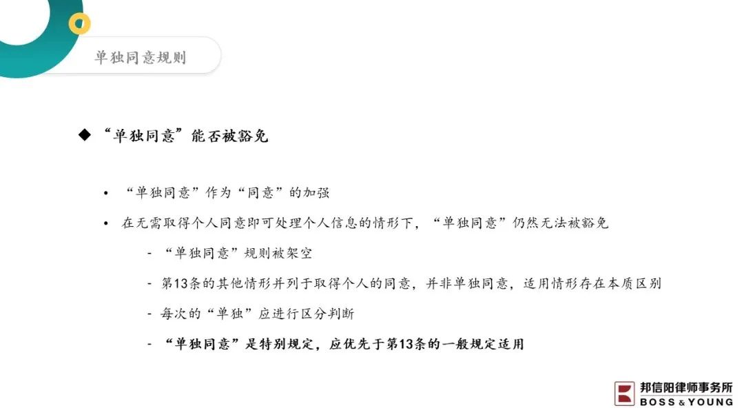 关于单独同意能否被豁免的问题,学界和实务界都存在争论。个人信息处理的基本逻辑是“知情+同意”,在此基础上,《个保法》第十三条设置了一些豁免情形。至于单独同意是否能够同样适用上述豁免规则,有一种观点认为,单独同意作为“同意”的加强,在无需取得个人同意就可以处理个人信息的情形下,单独同意仍不能被豁免。如果可以被豁免,单独同意规则就会被架空。单独同意作为一条特殊规定,应当优先个人同意的一般规定来适用。