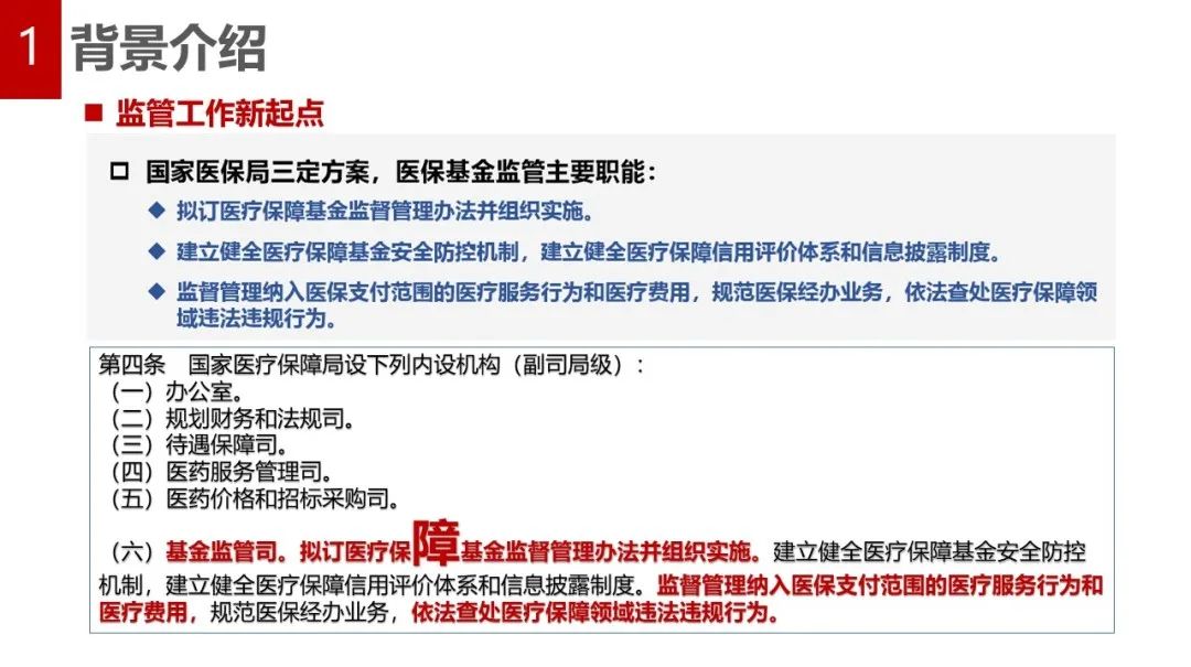 目前医疗保障基金监管行政执法和协议化管理并举。《医疗保障基金使用管理条例》第十三条是关于协议化管理的规定。第四十条是关于定点医药机构骗保的法律责任,尤其需要关注的是第四十条第二款的规定,实施第三十八条规定行为,定点医药机构以骗取医疗保障基金为目的,实施了第三十八条规定行为之一,造成医疗保障基金损失的,按照骗保处理。也就是说,如果以骗保为目的实施第三十八条行为,就会被认定为第四十条的骗保。定点机构尤其要关注被处罚违规违法行为的及时整改落实。第四十一条规定了个人骗保的法律责任。