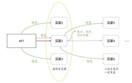 无论购买者在购买NFT后选择在网络中反复欣赏数字作品,还是将该数字作品上传至其他平台进行展示或作为头像使用,上述行为都是其基于对数字作品所有权或者基于与平台、艺术家之间的协议而享有的处分权范围,虽然这些后续行为可能是购买者购买NFT的主要原因,这些后续行为也极大可能会发生对数字作品的信息网络传播,但这些后续行为与NFT交易本身(红色线条)无关,更不能影响对NFT交易行为的本质定性,仍以上文所述前网络时代下画作和画纸的故事为例,画作的购买者在有条件的情况下对画纸上的画作进行二次复制、传播行为难道能够改变他获得画作的这一过程乃发行行为的定性吗?答案显然是否定的。