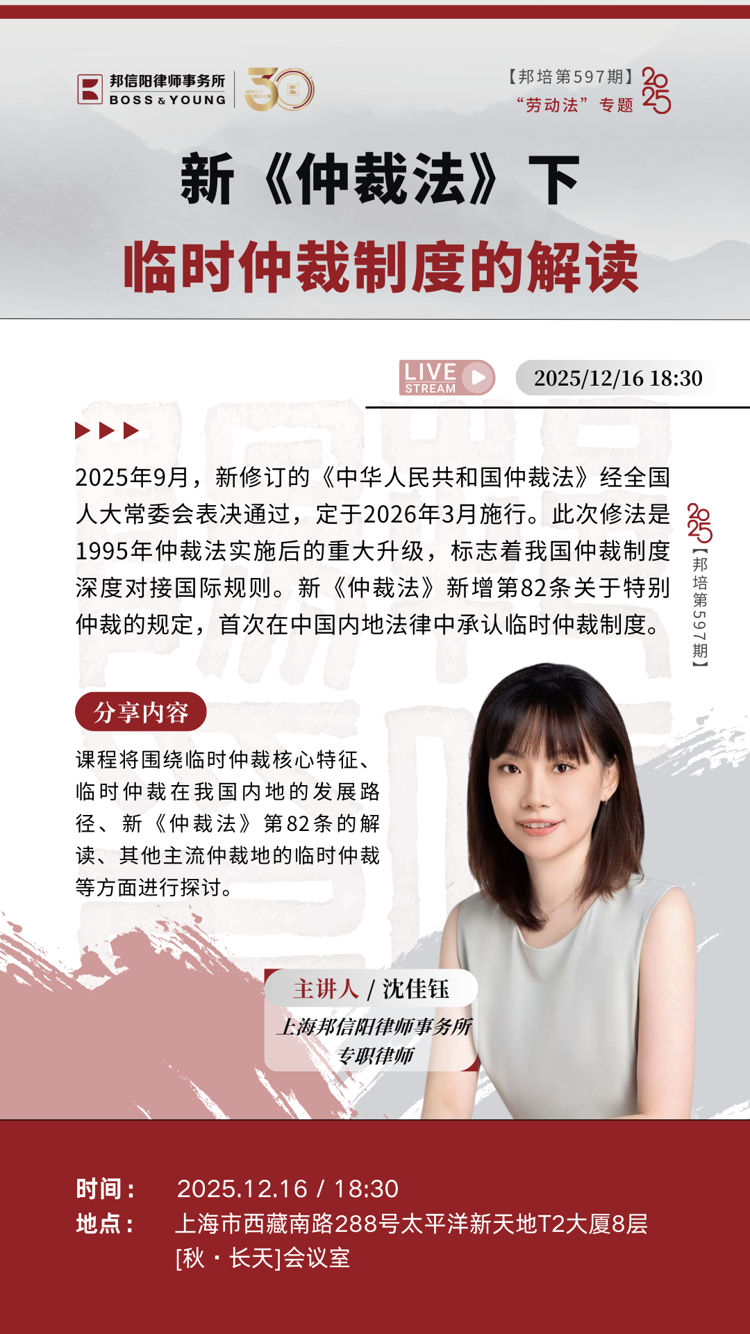 【邦培第597期:新《仲裁法》下临时仲裁制度的解读】12月16日晚在上海邦信阳律师事务所线下举行。