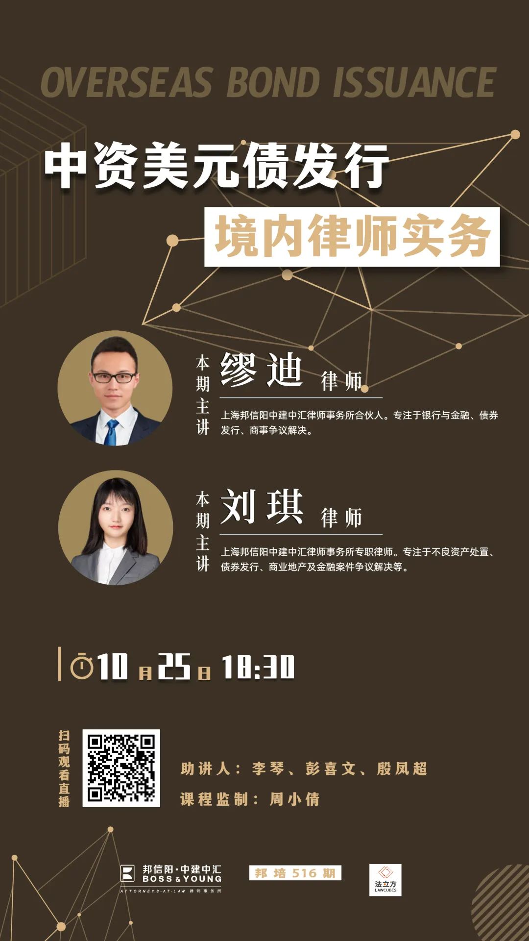 10月25日(周二)18:30,上海邦信阳中建中汇律师事务所合伙人律师缪迪及专职律师刘琪共同主讲邦培第516期——《中资美元债发行境内律师实务》。