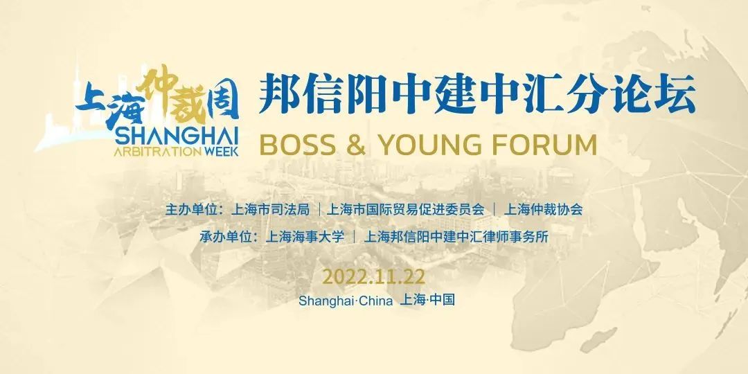 2022年11月22日,“2022上海仲裁周-邦信阳中建中汇分论坛”(2022 Shanghai Arbitration Week--Boss & Young Forum)即将在上海市黄浦区中山南路100号15楼拉开帷幕。