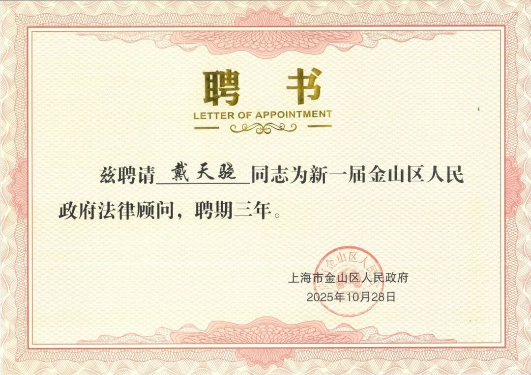11月19日下午,金山区举办新一届区委法律顾问、法律专家库成员、区政府法律顾问及行政复议委员会委员聘任仪式。上海邦信阳律师事务所(以下简称“邦信阳”)党委副书记、合伙人戴天骁律师受聘担任新一届中共金山区委法律专家库成员、金山区人民政府法律顾问。