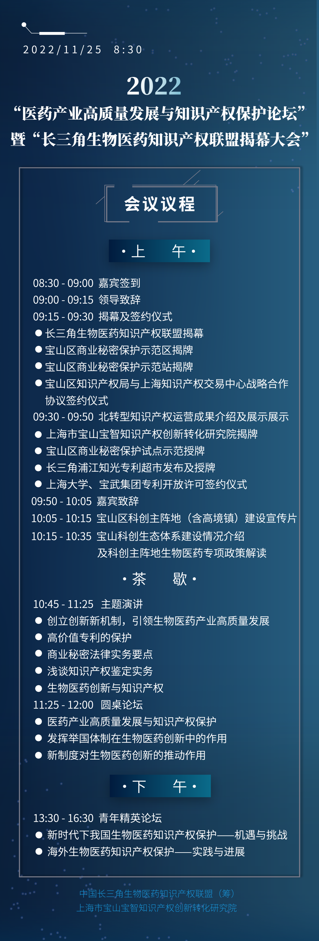 为切实贯彻《长江三角洲区域一体化发展规划纲要》精神,提高长三角地区生物医药知识产权保护水平,2022“医药产业高质量发展与知识产权保护论坛” 暨“长三角生物医药知识产权联盟揭幕大会”将于11月25日(周五)9:00召开!