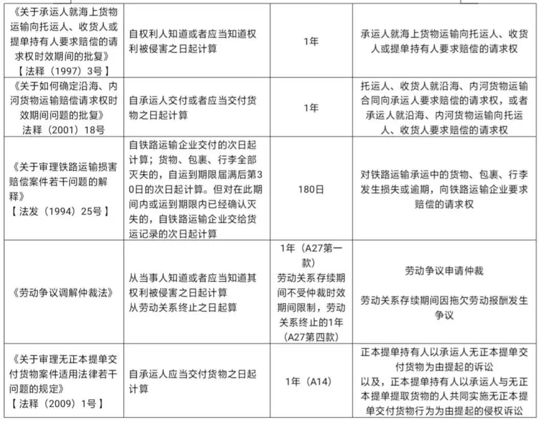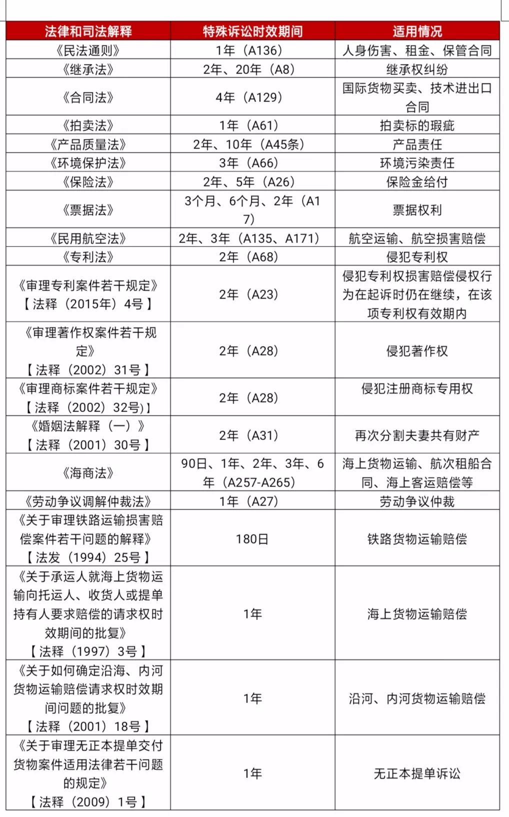 三是特别诉讼时效的期间,根据学者整理,目前《民法通则》、单行法及有关司法解释中一种规定了10种长短不一的特别诉讼时效期间,具体如下表[9]: