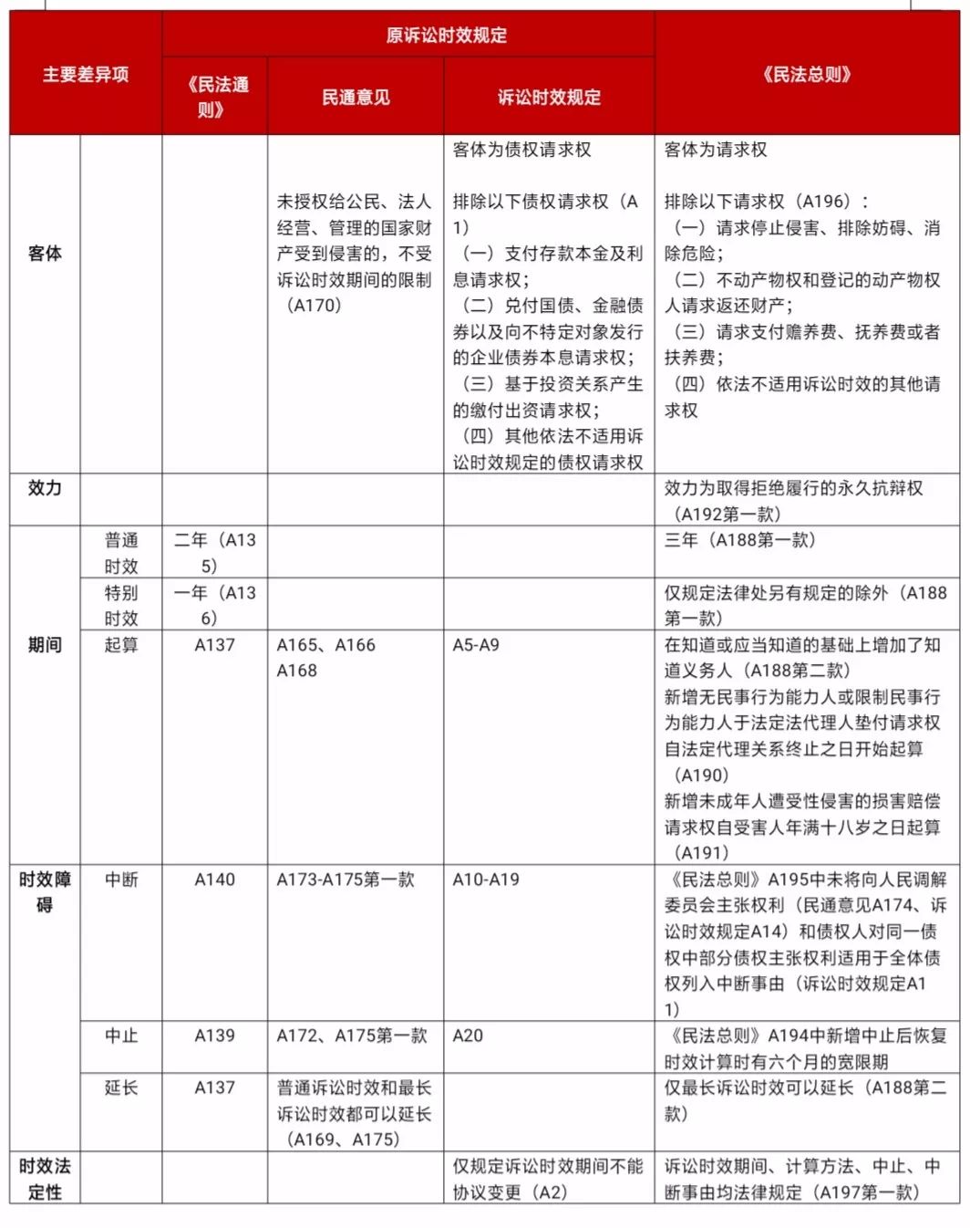 在《民法总则》颁布之前,原诉讼时效的基本制度是由一部法律即《民法通则》和两部司法解释合计四十五条律文构成的(详见笔者之《诉讼时效漫漫谈》一文)。为方便与现行《民法总则》相比较,笔者试将《民法总则》与原诉讼时效规定的一些主要差别点列表对比如下: