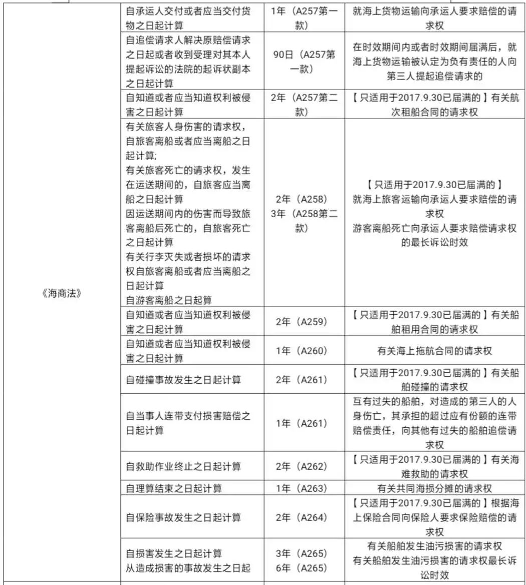 上海高院的法官也持同样观点,即认为考察相关法律的立法背景可以发现,单行法中规定的二年诉讼时效期间有的是因为立法时《民法通则》还未制定实施,有的是为与该法中的其他诉讼时效规定相区分,有的是因为在时效起算点等方面有特殊规定,但是就时效期间本身而言,不具有特殊性,与《民法总则》普通时效适用对象同一,可以认为《民法总则》的三年普通时效与民事单行法中规定的二年时效构成法律冲突,也应根据“新法优于旧法”原则替代适用三年时效[14]。个人感觉以上观点还是挺有道理的,由此上述列表中有关二年的诉讼时效期间也存在着2017年9月30日未届满时被《民法总则》三年时效追溯替代。