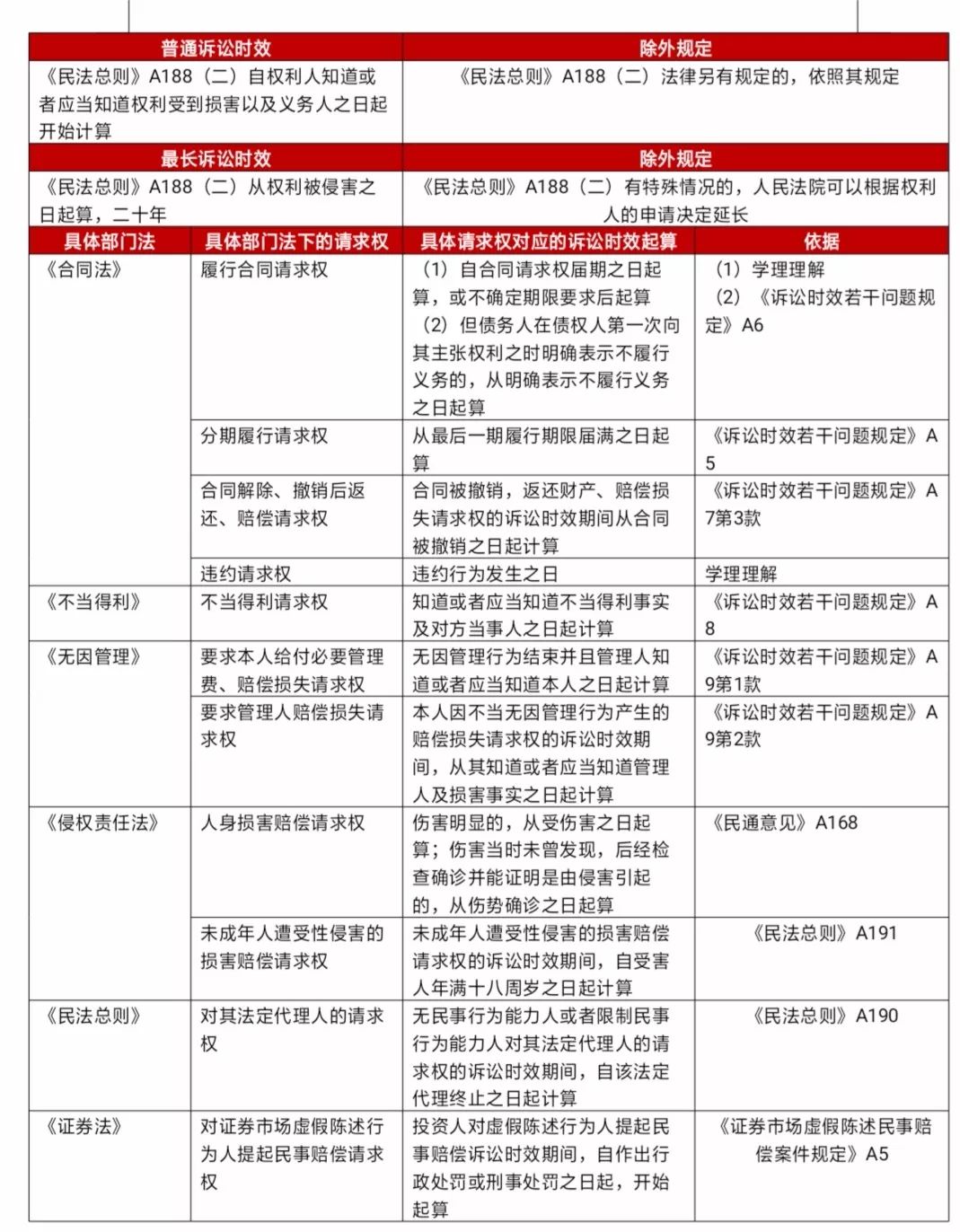 [9]图表摘录自杨巍:《民法时效制度的理论反思与案例研究》 北京大学出版社 2015年 第262页,表7-3,笔者基于现行法律进行了一些复核和添补。