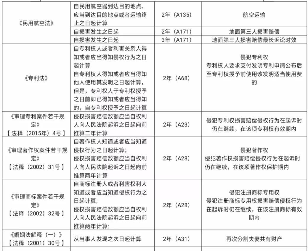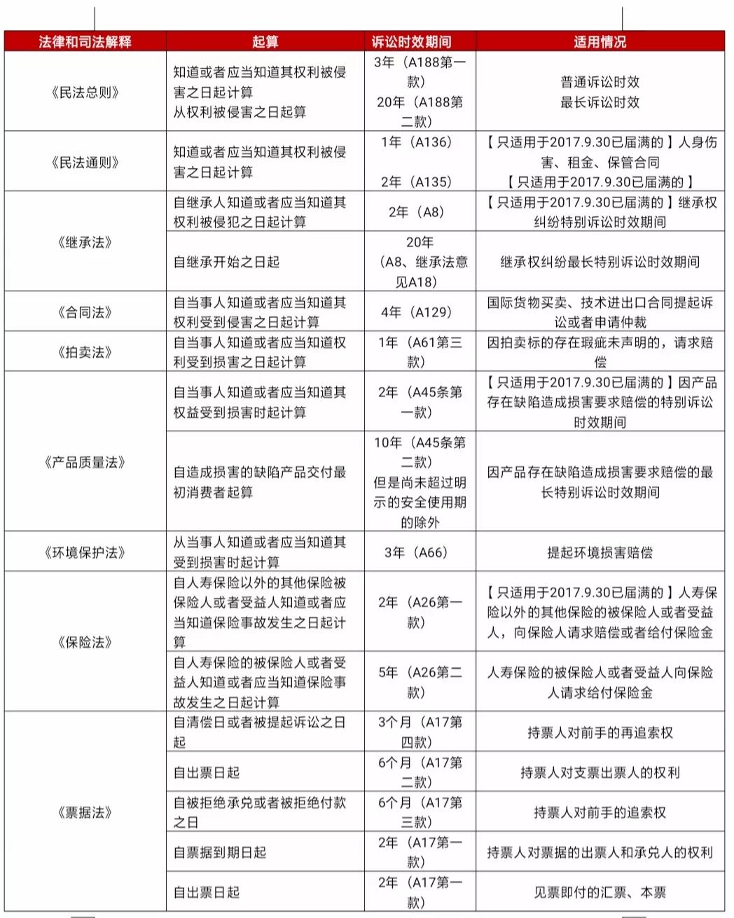 集上文普通诉讼时效、最长诉讼时效和特别诉讼时效的法定期间和起算,笔者查阅了相关的法律和司法解释,为方便全览,现将有关律文内容整理列表如下: