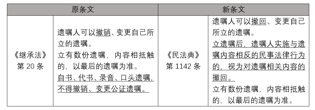 在法律上,撤销和撤回有约定俗成的用法。撤销针对已生效的意思表示或法律行为,撤回针对尚未生效的意思表示或法律行为。遗嘱作为死因行为,在遗嘱人在世时尚未生效,遗嘱人欲全部否定已立之遗嘱,应使用“撤回”概念。此处修改,体现了立法技术的细节进步,概念用法的一致,也是法律体系化的必然要求。