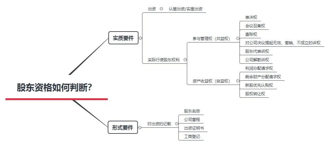 在涉及债权人与公司及其股东的外部法律关系时,应体现商法公示主义、外观主义的要求,保护善意第三人因合理信赖公司登记机关的登记事项而作出的行为的效力,以工商登记材料等形式要件作为确认股东资格的主要证据。而在涉及股东与股东之间、股东与公司之间的内部法律关系时,则应重点审查股东是否符合股权取得的实质要件,即是否向公司履行出资义务。《最高人民法院关于适用<中华人民共和国公司法>若干问题的规定(三)》第二十二条规定,当事人之间对股权归属发生争议,一方请求人民法院确认其享有股权的,应当证明已经依法向公司出资或者认缴出资,且不违反法律法规强制性规定。