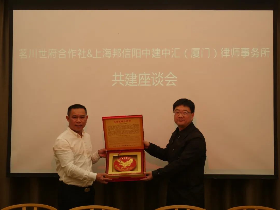 2022年10月23日,上海邦信阳中建中汇(厦门)律师事务所执行主任陈震、职斌、郑悦、王羲等一行至共建单位武夷山茗川世府合作社(下称:茗川世府)开展送法下乡活动。茗川世府黄正华书记、邱瑞良秘书长等热情接待了律所人员,双方进行了深入的交流。