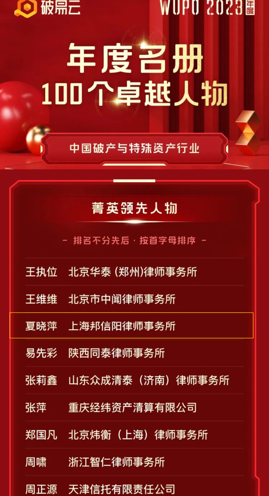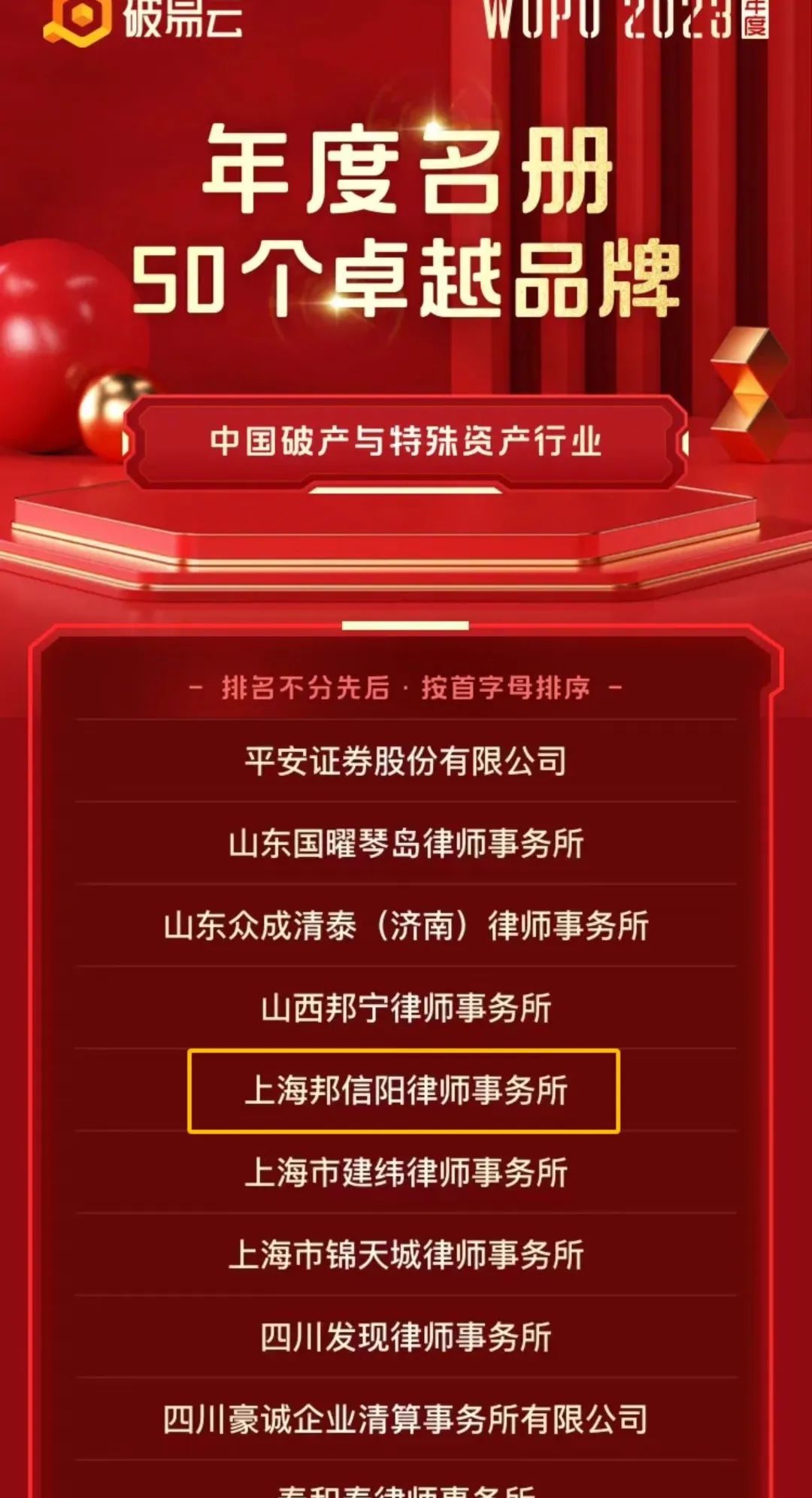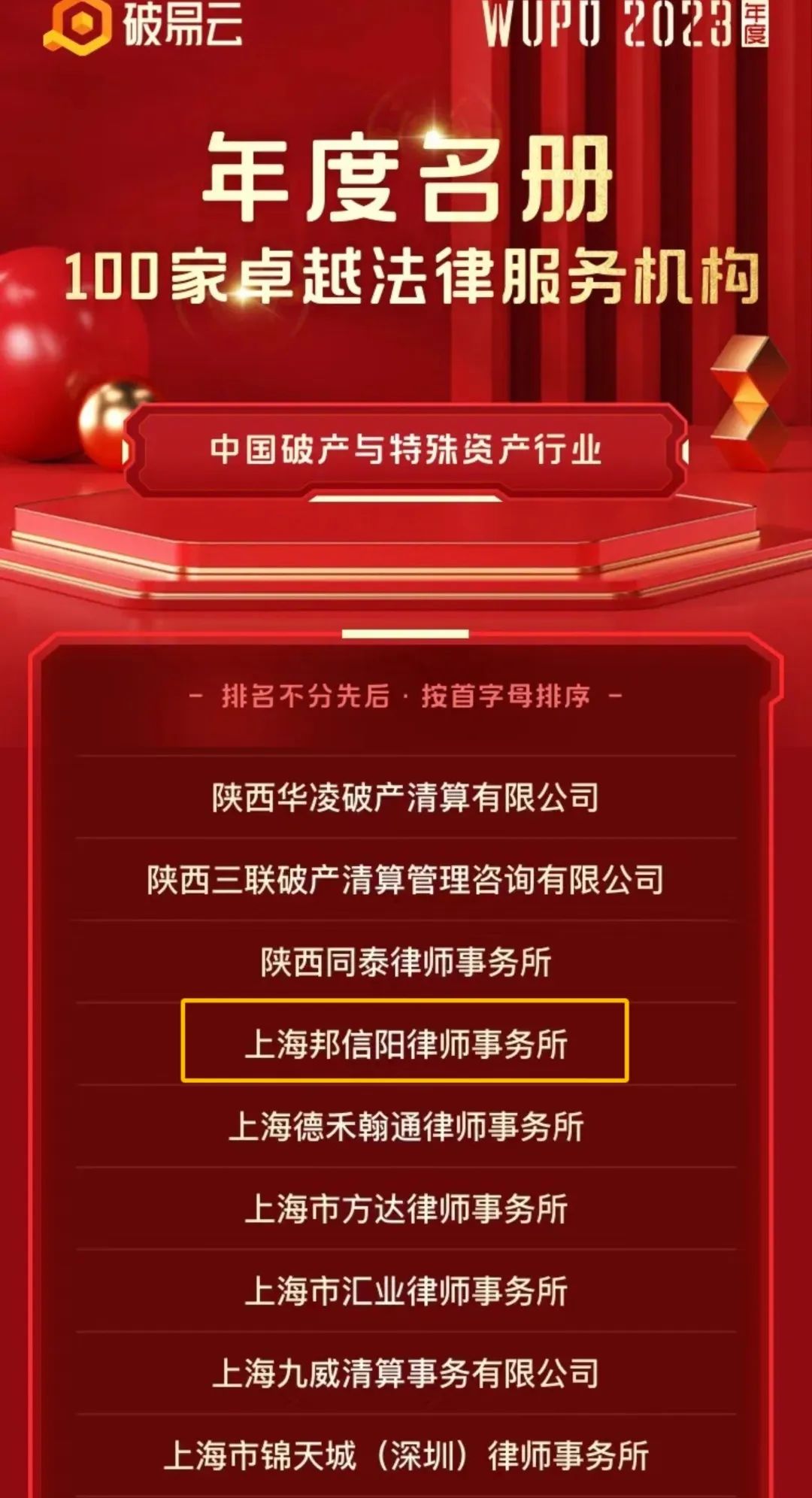 2023年12月3日,由破易云及法度研究院主办,以“破·焕新经济发展,立·重塑经济价值”为主题的2023年度“无破大会”在北京·梅地亚中心成功举办,并全程由央广网进行现场直播。上海邦信阳律师事务所入选WUPO 2023中国破产与特殊资产行业“100家卓越法律服务机构”名册,WUPO 2023中国破产与特殊资产行业“50个卓越品牌”名册,上海邦信阳律师事务所合伙人夏晓萍入选WUPO 2023中国破产与特殊资产行业“100个卓越人物”名册。