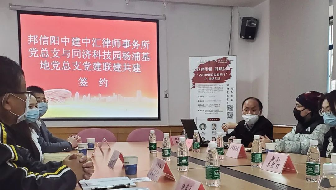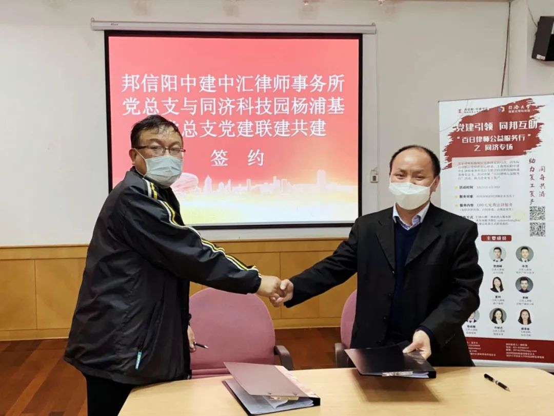 3月31日,邦信阳中建中汇党总支与同济科技园杨浦基地党总支正式签约。由双方牵头,共同推出的“百日律师公益服务行”活动正式启动。