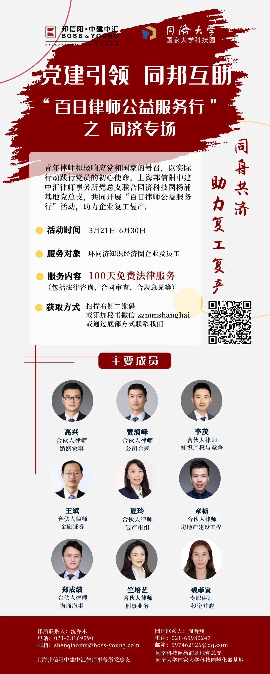 党建发展同关注,党建引领同行业,党建服务同心力。此次“百日律师公益服务行”活动是党建联建推出的第一个活动 (活动详情请见文末海报)。在未来,邦信阳中建中汇还将连同更多园区、行业协会等组织,加强党建联系,为更多存在疑难问题的中小微企业提供公益法律服务。