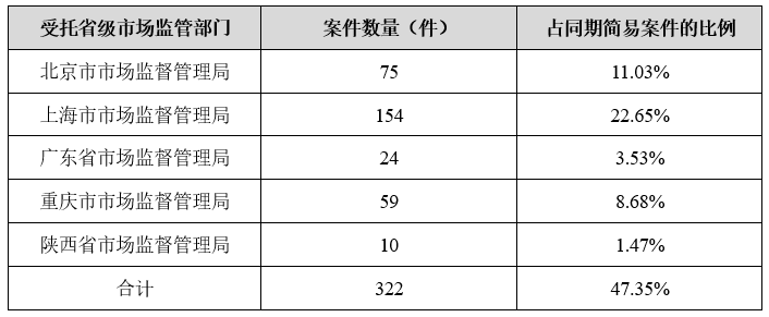 根据市场监管总局反垄断二司发布于2023年7月20日的信息,自2022年8月1日市场监管总局启动试点委托北京、上海、广东、重庆、陕西五省市市场监管部门开展经营者集中反垄断审查工作以来,共委托审查经营者集中案件287件,占同期申报简易案件40.7%。