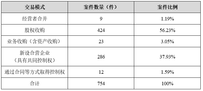 (1)交易模式以股权收购、新设合营企业为主。在754件无条件批准案件中,各类交易模式的案件数量如下: