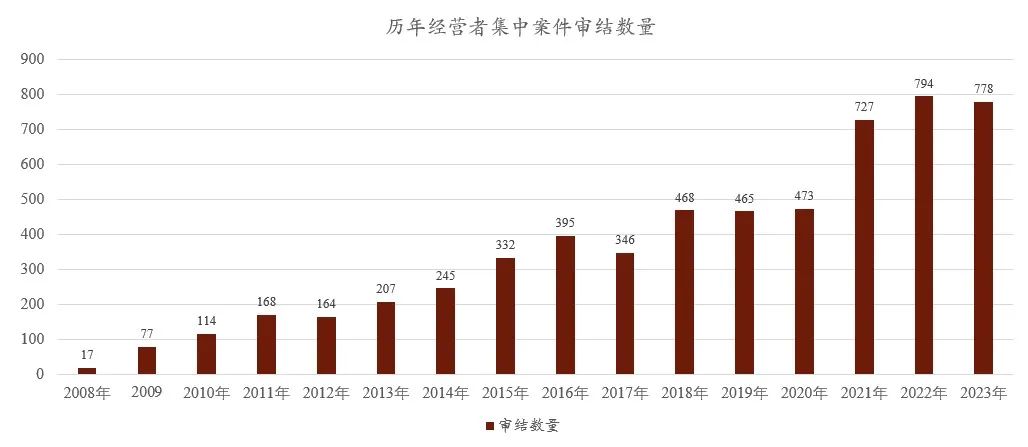 根据本文对公开信息的统计,我国《反垄断法》施行以来至2023年度,共审计经营者集中案件5770件,禁止3件,附加限制性条件批准61件。我国历年经营者集中案件审结数量情况如下: