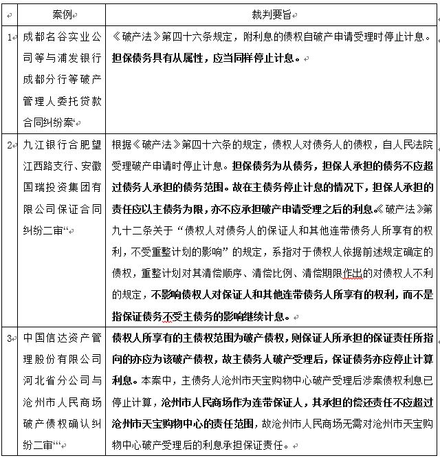 夏群佩、洪海波法官撰文指出:担保制度得以有效运转,在于债权人的风险转移以及担保人取得追偿权两大功能,担保制度缺少上述两大功能的任何一项都将不能存续。因此,在制度设计中,在优先考虑债权人利益的时候,对担保人的利益也应予以适当考虑。破产案件受理后对主债权停止计息,债权人受损失的仅是利息损失,如果债权人及时对保证人行使权利,即使保证债务也停止计息,债权人的损失也不会很大。如果对保证债务不停止计息,最终影响的是保证人的追偿权,而在法律没有特别规定情形下仅凭对法律的解释而剥夺保证人的追偿权,对保证人难言公平,这样的处理方式有违上述担保两大功能的实现,社会效果也不会理想。[ix]