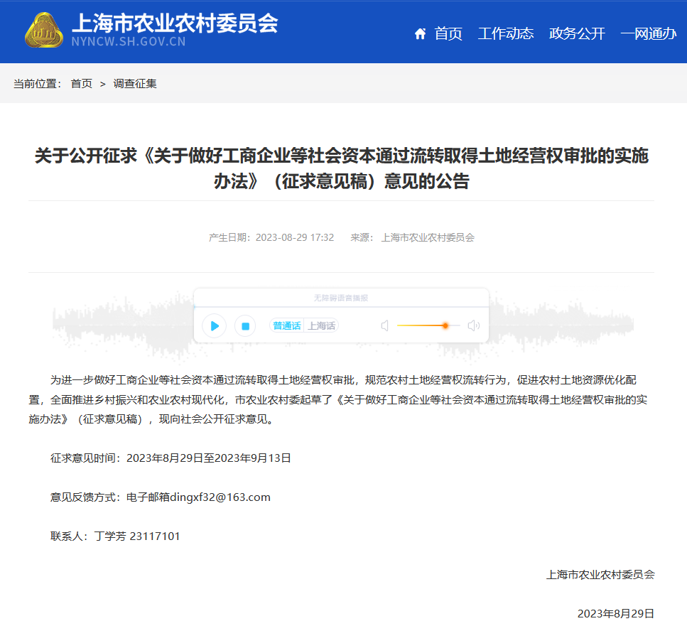 上海市农业农村委在8月29日在其官网发布了《关于公开征求<关于做好工商企业等社会资本通过流转取得土地经营权审批的实施办法>(意见征求稿)意见的公告》。最重要的内容已经在文件名称中体现,即对工商企业等社会资本通过流转取得土地经营权实施行政审批。今年7至8月,除上海外,江苏、浙江、安徽、江西、广东、湖南、河北、天津、重庆、西藏等多个省级农业农村部门相继发布了对社会资本流入土地经营权进行审批的规范性文件,正在向社会征求意见中。这是值得关注的情况,说明这个行政审批事项的具体落地势在必行。
