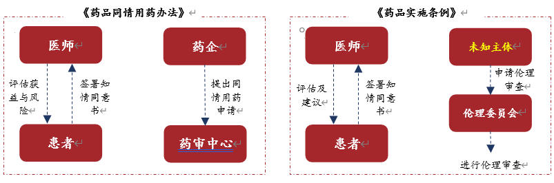 在2017年公布的《药品同情用药办法》中第五条指出,“注册申请人需向药审中心申请开展拓展性临床试验,获得批准后方可实施。”而2022年公布的《药品实施条例》第一百条第二款规定,“药品同情用药试验药物应当遵循患者自愿要求、符合医学伦理和知情同意的原则,经伦理委员会审查同意后,可在开展临床试验的机构内由具备试验药物使用经验或者培训经历的医师用于与受试者病情相同的患者。”该条款中规定开展药品同情用药应当经过伦理委员会审查同意,但并未提及药品同情用药需要药审中心审批后方可进行。