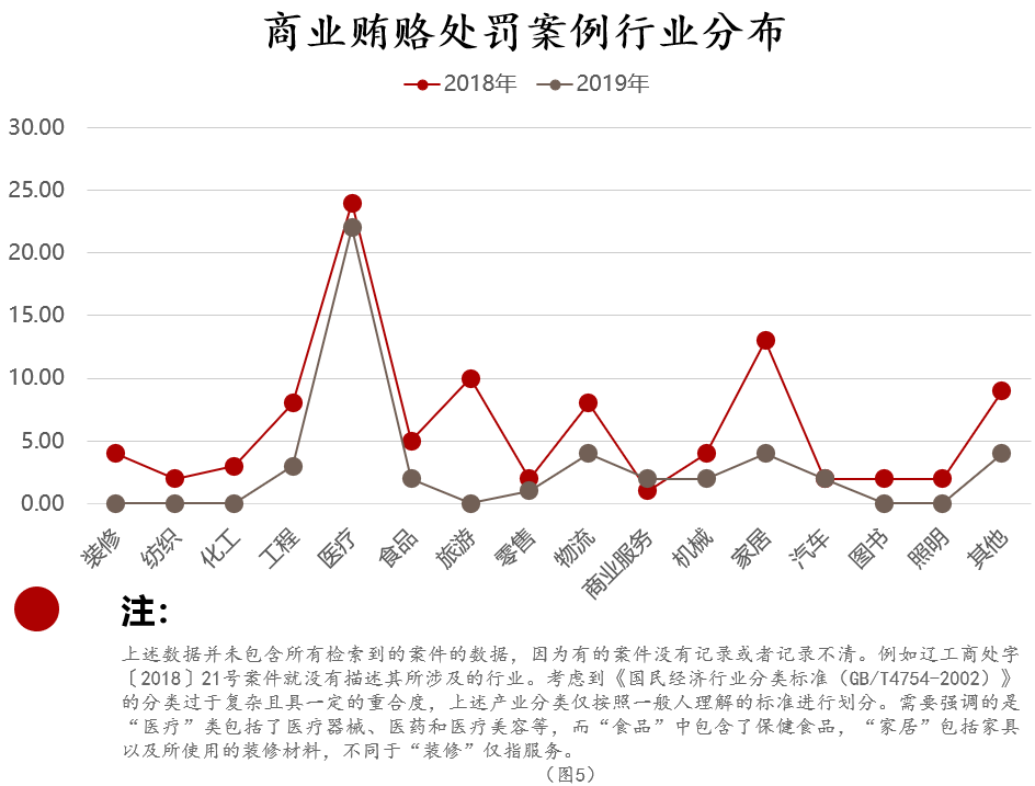 根据上图的数据,医疗(包括医药和医疗器械和医美企业)行业无论是在2018年还是2019年都是商业贿赂执法的重中之重。其中2019年医疗领域的执法案件数量比2018年少一些。但是如果从此类案件数量所占当年执法案件总数量的比值来看,2019年占比(48%)比2018年占比(24%)翻了一番。可见,该领域不仅是执法重点领域,同时也是加强执法的重点领域。医药和医疗器械企业应当积极关注该行业的执法与变化趋势。除了医疗领域之外,其他执法案例相对较多的还有工程、旅游、物流、家居等行业。这些行业与医疗领域相比而言最大的区别是这些行业的案例都是系列案件,而医疗行业的执法并非是系列案件。