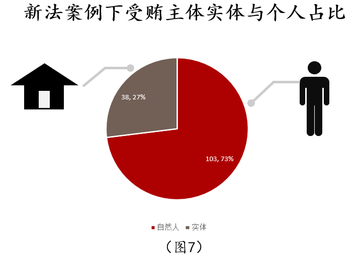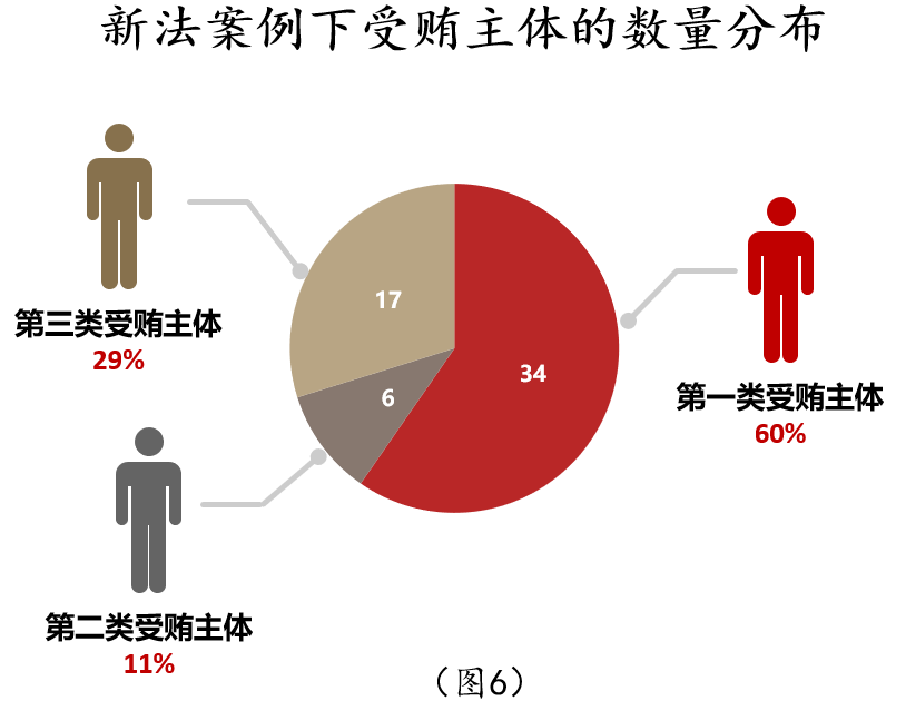 以下我们从两个方面对受贿主体进行划分和数据统计:第一个方面是根据新法具体规定中的三种受贿主体进行划分和统计,第二种是根据受贿主体为自然人还是实体进行分类。第二种划分的意义在于实体通常是交易对手方,相对于个人其支付的合规性相对难以进行评价。