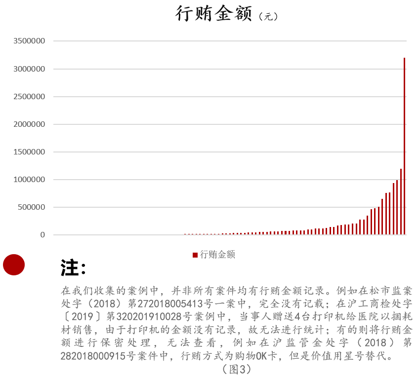 在上图中最低的数值是400元人民币,其贿赂行为是给设计师的返利。另外还有604.8元的宴请医生的费用等。从上图可见,最高数值达到300万以上。可见,执法案件中的“处罚门槛”的范围非常宽泛。